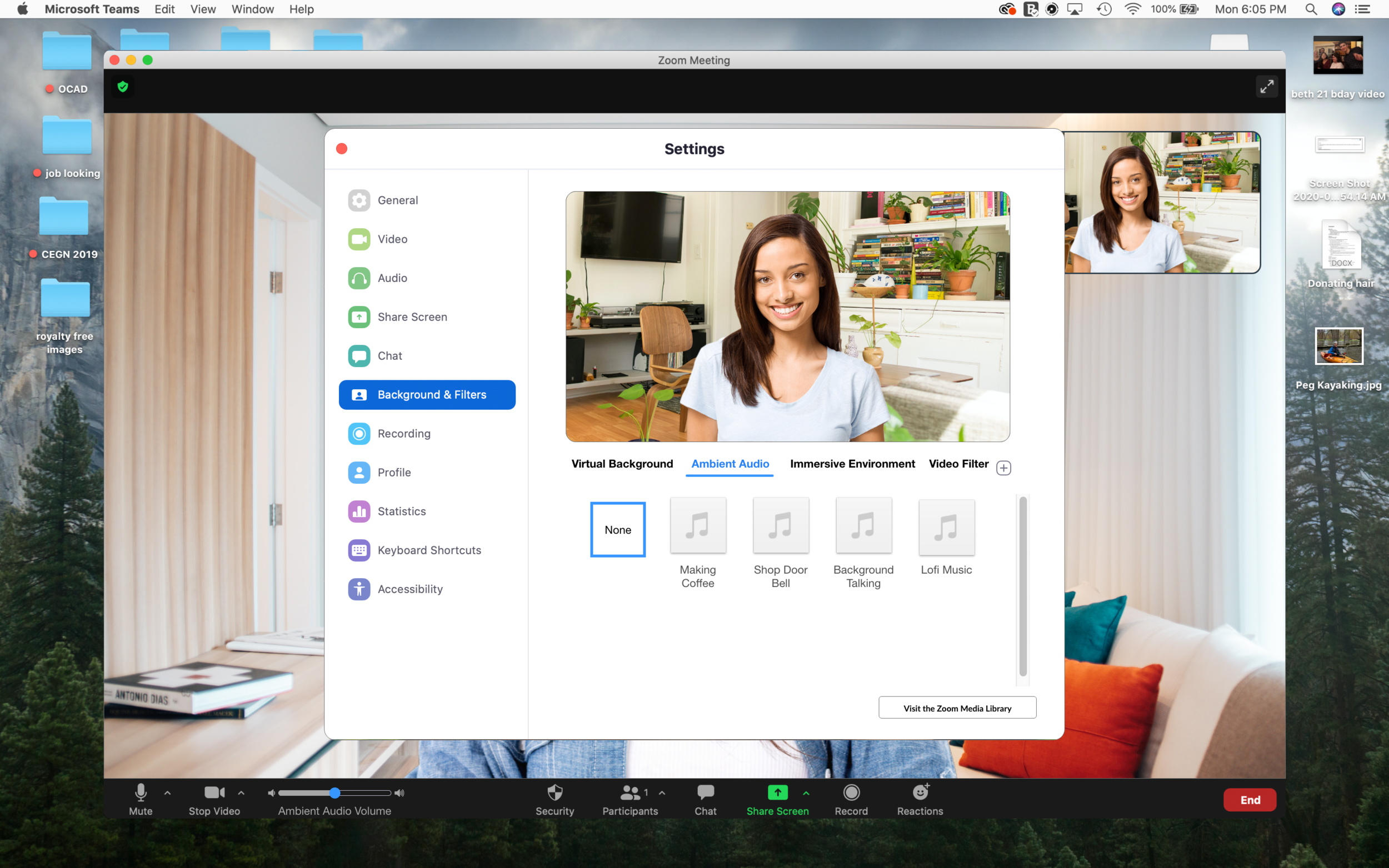 Create custom online environments by combining virtual backgrounds with audio mixes all within Zoom.